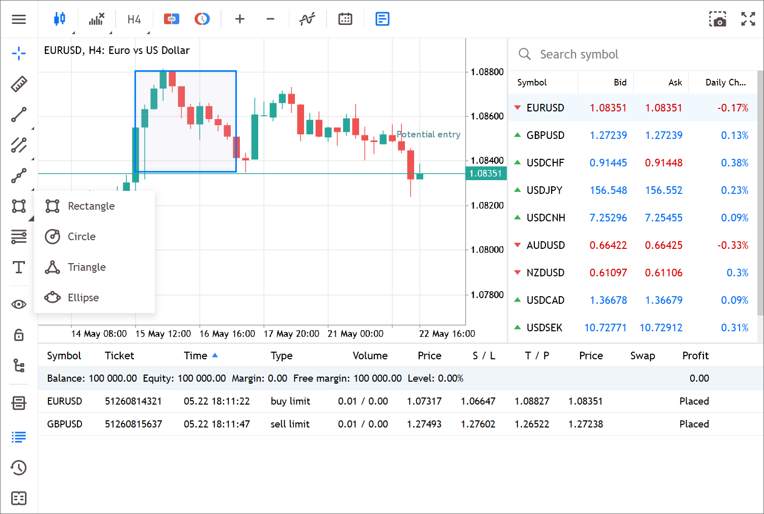 1. 扩展可用分析对象的列表。现在,您可以利用标尺来测量时间和价格,绘制图形(矩形、椭圆形、三角形和圆形),并向图表添加标签。所有对象都可以在左侧面板中找到: